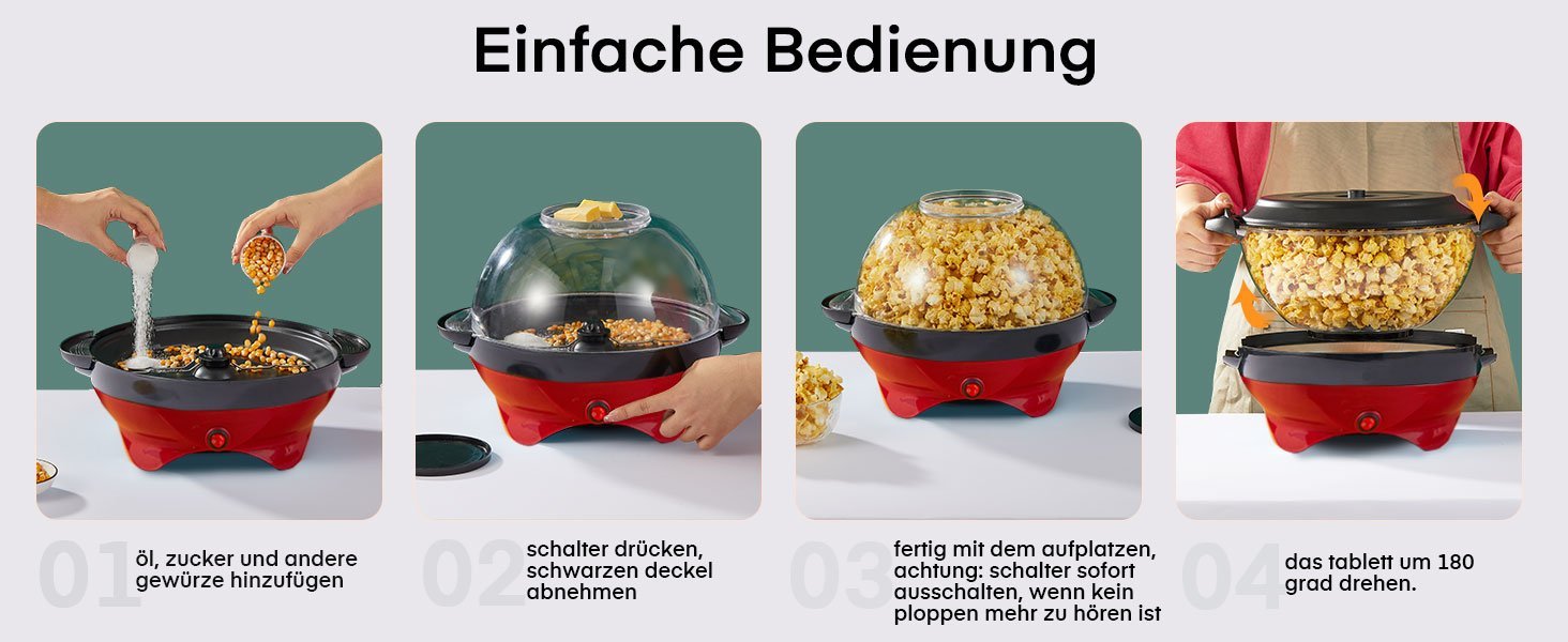 Sehr einfache Bedienung, auch Kinder k?nnen damit umgehen. Einfach einschalten und warten, fertig ist das Popcorn.